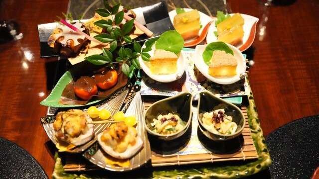 まずは生ビールでのどを濡らします。ヱビスビールなのがうれしい。お料理は先付け、小鉢、小皿が先鋒です。特筆すべきは南京すり流しと鼈甲庵ですね。上に鴨ロース煮とトリュフがあしらわれ、こはくのような鼈甲庵の中にフォアグラが埋まっている。様式はフレンチで見るカクテル風のアペリティフですが、かつおのだしが凝縮された上品なゼリーと上に乗るカボチャのすり流し(ムース様のもの)をいただくとあら不思議。カボチャの煮物を彷彿とさせる懐かしい味になります。ふだん見慣れない料理が、よく知るおふくろの味になるという遊び心がニクい。