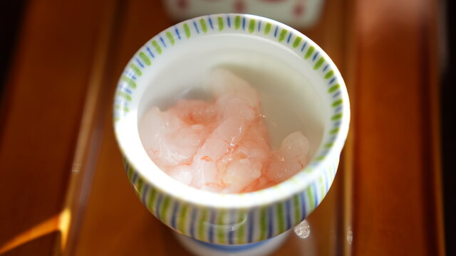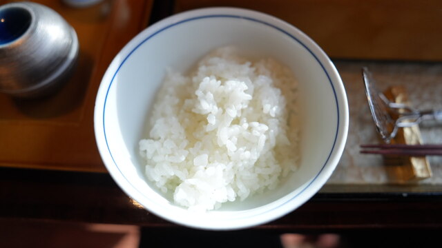 どれも逸品なのですが、特に印象に残ったのがナスとたらこの寄せものと、柿の形にしつらえた白玉。たらこの旨味とナス独特の味わいと食感がよく、思わず酒が進んでしまう。白玉は中に牛の時雨煮が入っていて、この意外性に不意打ちをつかれました。