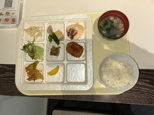 私が好きだったのは、鯛めし(濃過ぎない味が好き)、クリーミーコロッケ(サクサクトロトロ)、鯛カツ(サクサクでレモンがきいてグッド)、チーズリゾット(一口サイズ盛りで味変用)、そば、カレー、生搾りみかんジュース(ボタンひとつで絞ってくれるマシーンあり)、味噌汁(白味噌で好みの薬味で大満足)でした。