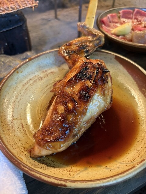 山賊焼は大きな骨つき鶏肉を串に刺してあり、食べる姿はまさしく山賊。タレが美味しい。