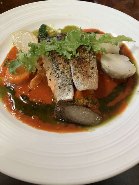 サーモンの香草焼きもボリュームがあり、サーモンはやや柔かめでしたが皮はパリッとしていて、付き合わせの野菜も美味しく、トマトベースのソースもマッチしておりました。