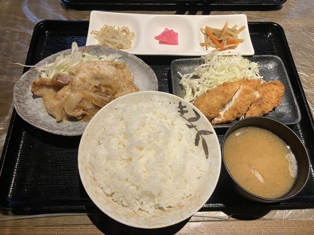 ボードから好きな二品を選ぶ仕組みで、相方が絶対美味しそうだと言っていた豚しょうが焼きとササミチーズカツをオーダー、ライスは無料で大盛りを選べます。