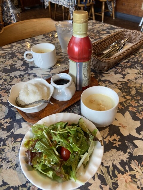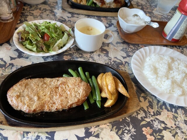 初めて入った軽井沢のとても静かにBGM流れていて熱々ポタージュとサラダメインのハンバーグステーキが来て大根おろしとちょっと甘めのソースをかけてジュージュー音をたててる鉄板で頂いて紅茶美味しいお店