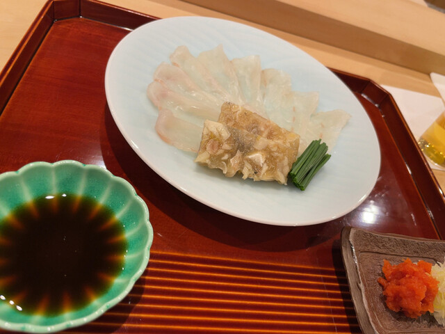 こちらも熟成させた舞坂(浜松)の虎ふぐのお刺身と煮こごり。ポン酢、もみじおろし、ねぎでいただきます。