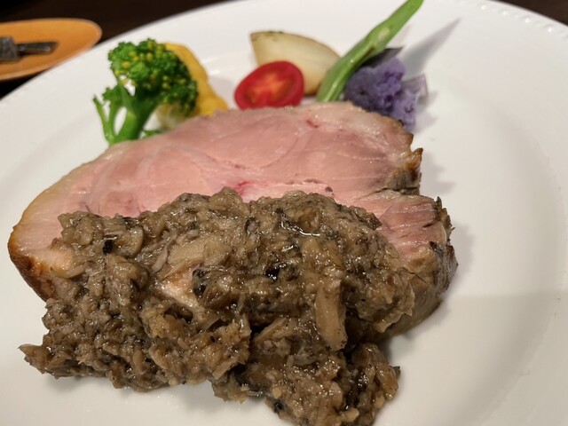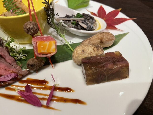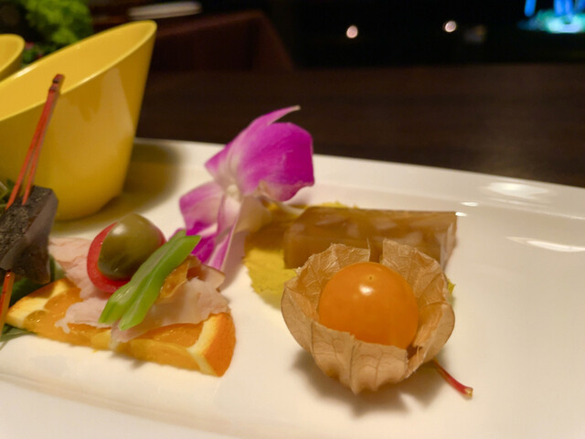 南部かしわスモークハム、ムキタケの寒天、鬼灯