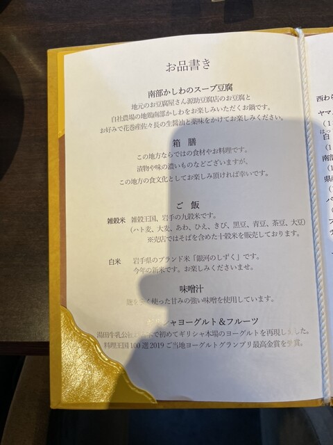 今回は珍しく旅館について書かせていただきます。僕が唯一毎年リピートしている本当は教えたくない神旅館です。それが岩手県は和賀郡にある『山人』- yamado -さんです。 新幹線での行き方については1つ前(1年前)の投稿に書かせていただいているので今回はお車での行き方についてとても雑に書いていきます。笑 ------------------------------ ~車での行き方~ 東京 ▶︎ 宇都宮方面 ▶︎ 東北道(盛岡方面)に進むこと 5時間半ほどで着きます。笑 ~ 休憩におすすめのSAとPA ~ ・守谷SA とにかくデカイ ・羽生PA 江戸時代風で楽しい ・那須塩原SA チーズケーキが美味しい ・錦秋湖SA 紅葉が綺麗 ※ルート選択によっては通らないSAもあります。 ------------------------------ と言った感じ。 超雑なので雑に参考にしてあげて下さい。笑 --本日いただいたお食事------------ ■コース … ダブルメインコース ~夕食編~ ・バーニャカウダー ・前菜盛り合わせ ・ウサギモタシのカクテル ・吉次(キンキ)のスッポン煮 ・天ぷら2種 ▶︎ 天然舞茸 ▶︎ かしわ天 ・白金豚のロースト ・きのこ雑炊 ・秋のフルーツパフェ ~朝食編~ ・南部かしわのスープ豆腐 ・6種の箱膳 ・雑穀米 or 白米 ・味噌汁 ・ギリシャヨーグルト ・フルーツ “無限追加OKメニュー” ・西わらびの一本漬 ・ヤマメの一夜干し ・白金豚のベーコン ★ ・南部かしわのソーセージ ★