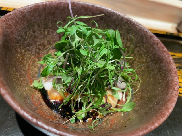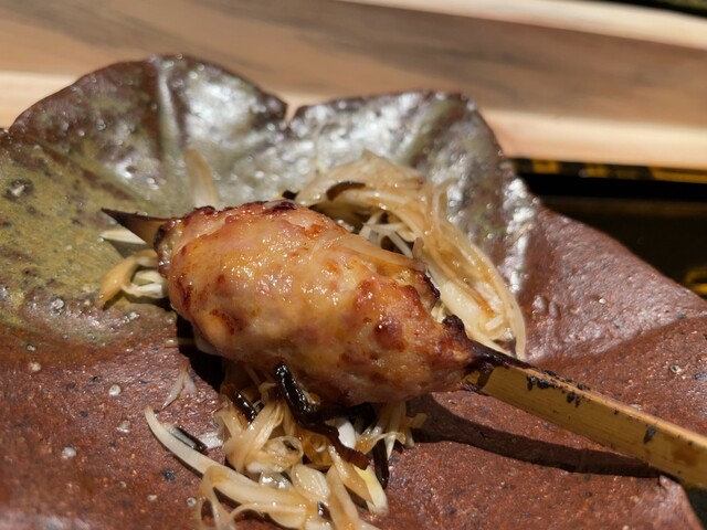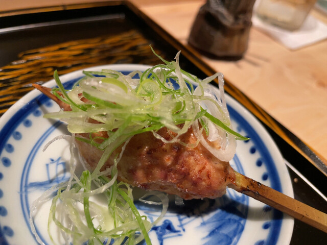 白髪ネギと塩昆布ごま油を混ぜ合わせた物を天城軍鶏のつくねの上に乗せた一品。まじ美味いです。