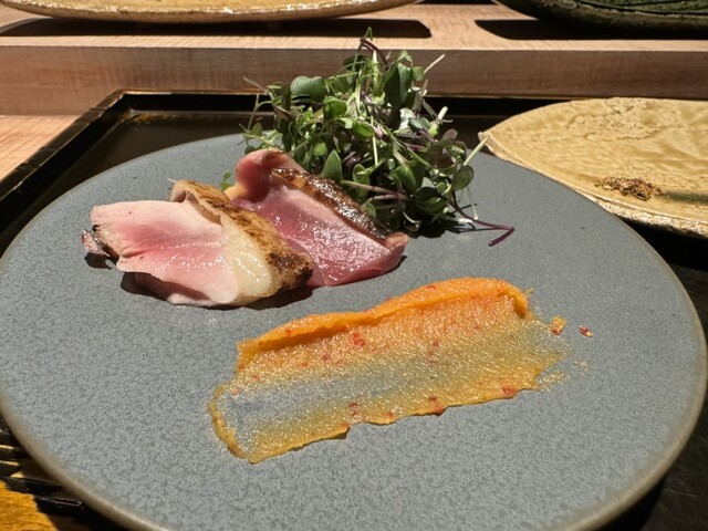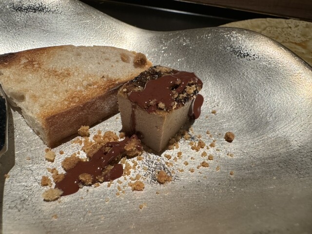 こちらは天城軍鶏のレバーパテになんと『自家製のホワイトチョコ』を乗せた一品。初めは文字通り度肝を抜かれたのですが、この意外性ある味の足し算はマジで天才です。
