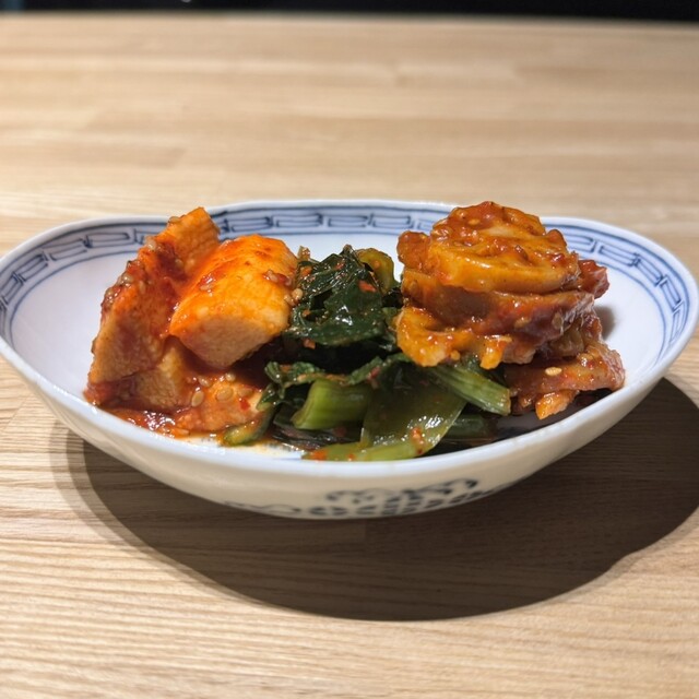 ①キムチ盛り合わせ(山芋、スルメ、蓮根)