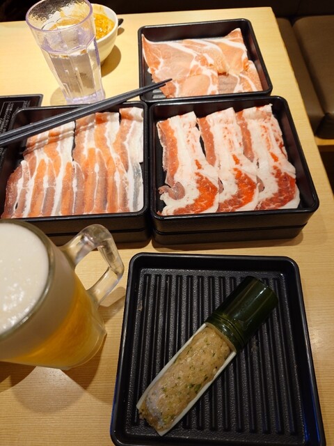 すき焼き風だしと焼きあごと生姜のみぞれだしとの相性でスタンダードコース(牛、豚ロース、豚バラ、鶏つくね)で選びました。