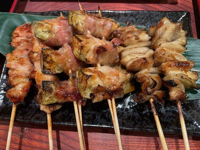 「もも(150円/本)」と「ナス豚バラ巻き(230円/本)」と「かわ(150円/円)」