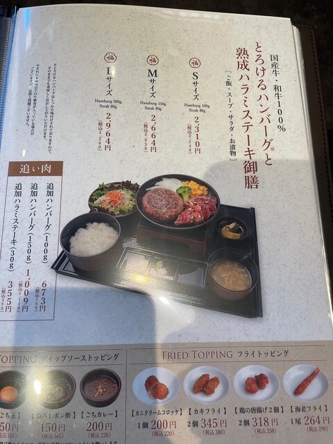 今回注文したのは「とろけるハンバーグと熟成ハラミ御膳【Mサイズ】(2,930円)」に「海老フライ(290円)」をトッピング。