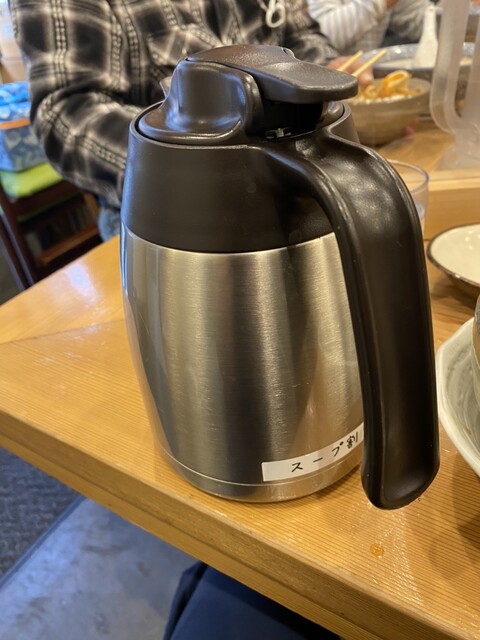 シメのスープ割りはカウンターにポットで用意されている出汁をセルフで足して頂く