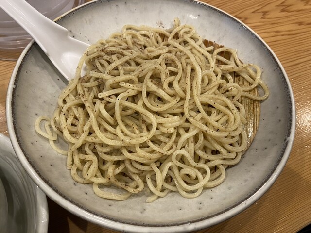 つけ汁の温め直しをお願いする間に麺に山椒を振って味変