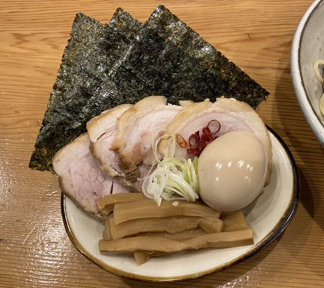 順を追っての店の向かいの丸芳牛肉店のチャーシュー、元住吉高喜商店の大判海苔、青森の中月産業の味玉をつけ汁に浸して麺に絡めて頂く。