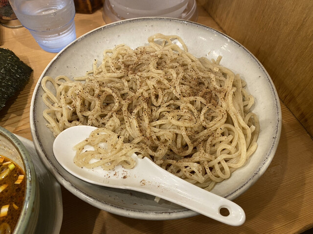 つけだれは冷めた時点で温め直しをお願い出来るので、この待ち時間の間に麺に山椒を振って後半(フェーズ4)に備えるのがお勧め。昔通い出した頃はたれに山椒を振ってたのだが、奥様(現在は育児休暇中)から「麺に振るのがおすすめ」と聞いて以降、これがやみつきになった。