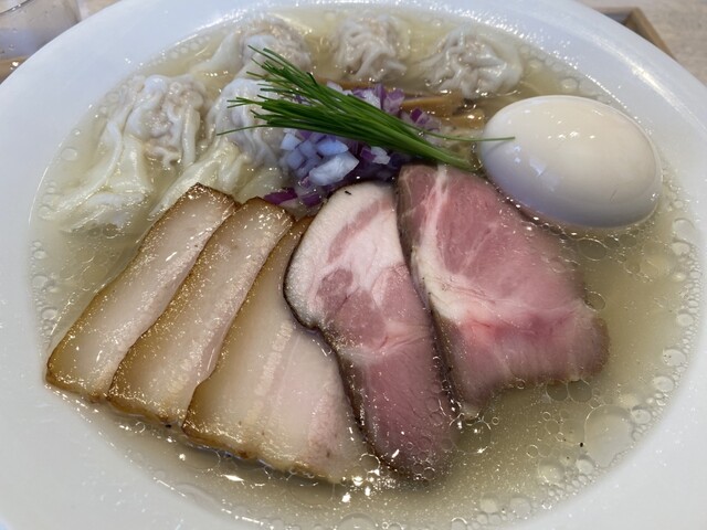 ちょうど1年ぶりの訪問だったので、お決まりオーダーで特製中華蕎麦〈塩〉¥1,700の大盛(+¥200)に更にワンタン2個¥200を追加して頂いた。