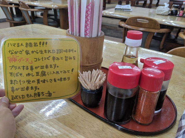 卓上にはソース、しょうゆ、七味、コーレーグースーが置いてあります。