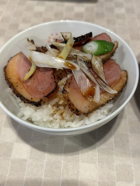 炙り鴨丼は小さめの丼に鴨肉が4枚と長ネギが乗っています。最初にご飯をいただくと、やや柔らかめのご飯に鴨肉のタレと鴨肉が焦げた香りが移っていてとても美味。もちろん鴨肉も柔らかく、丼も美味しくいただけます。