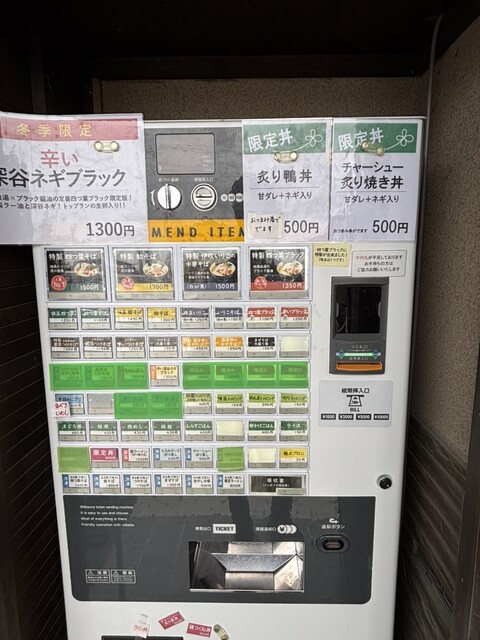 まずは食券を購入。券売機では前に2組。並び列にはざっと12、3人が並んでいます。人気No.1の特製四つ葉そば、限定丼の炙り鴨丼をチョイス。本日のにぎり(まぐろ、いわし)をシェアし、いわしをいただくことにします。