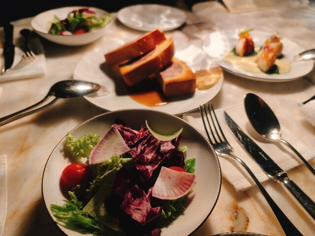 今回は飲み放題付きのコースを利用しました。テーブルに置かれたライトで照らしながら写真を撮りましたが、暗さもあって手元はあまりよく見えません。ただ、雰囲気重視のお店という印象で、お料理はいずれも美味しく楽しめました。スパークリングワインやワイン、カクテルの種類も豊富で、飲み放題でも十分に満喫できます。