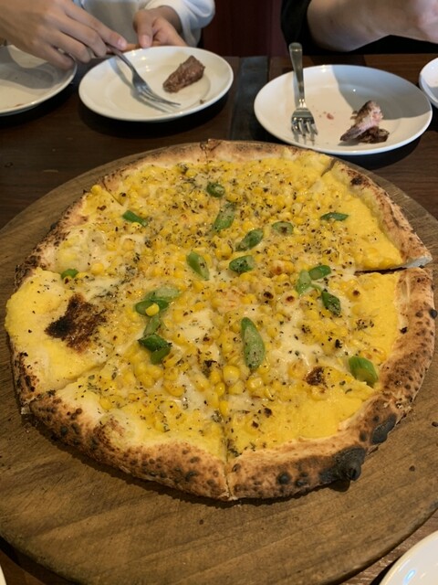 お店おすすめの骨付きリブをはじめ、マルゲリータ、コーン系ピザ、飲み物にノンアルビール、中学生の娘は冷製コーンスープをオーダー。