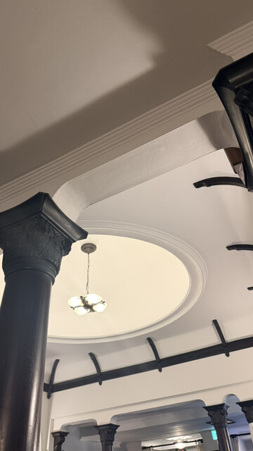 並びましたが回転早く割と早く案内されました。創業は昭和10年だそうです。モダンなインテリアの店内にドーム天井に素晴らしい照明癒されます。