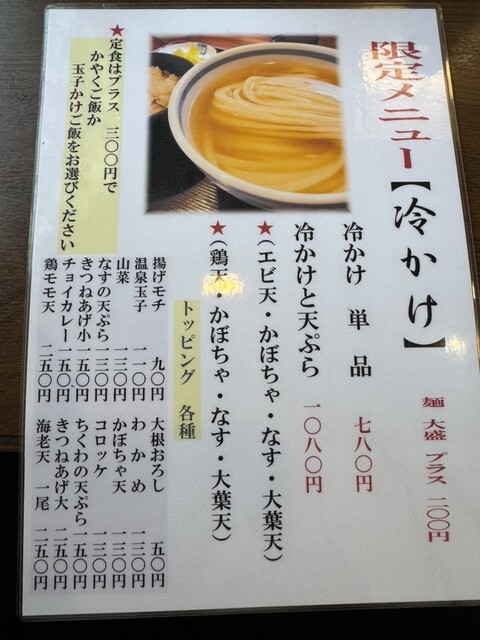 冷やかけは、冷たいいりこの出汁がキリッと効いて、喉越しのよい一品!
