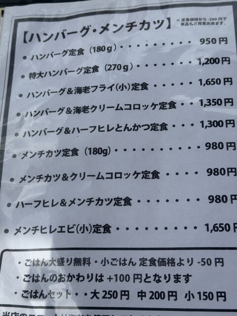 メニューと睨めっこしていましたが、店内の黒板メニューが気になり、メンチカツ&エビフライ(中)定食をオーダーしました。