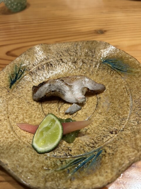 ヒラメの造りから始まり、あじ、メジマグロ、エビの昆布締めとお造りが続きます。お造り自体は珍しいものでもないのですが、なぜか唸るほど美味しい…。ついで、海苔で巻いて食べる生ウニが供されました。はじめビールと一緒にいただいてましたが、お勧めの日本酒に切り替えました。加賀の月という日本酒です。これがまたベストマッチ。その後、宗玄のそっという飲んだことのない日本酒もいただきました。