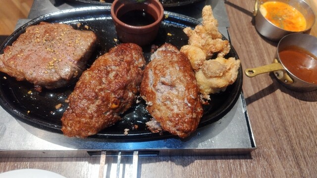 注文したのはコンボB、厚切りサーロインステーキとハンバーグのセット。唐揚げもついている夢の様なメニューです。