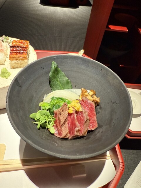 お出汁をかけるとすこしお肉に火がはいって温度もちょうどよく!