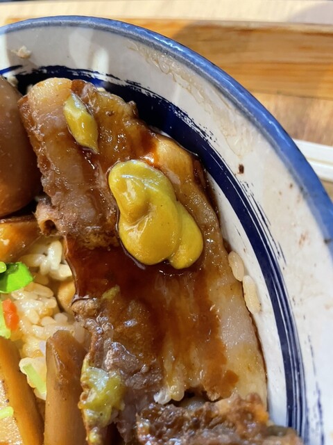 豚バラ大根丼→トロトロの厚切り豚バラ、鍋底大根、卵(ハーフ)、刻み長ネギ。