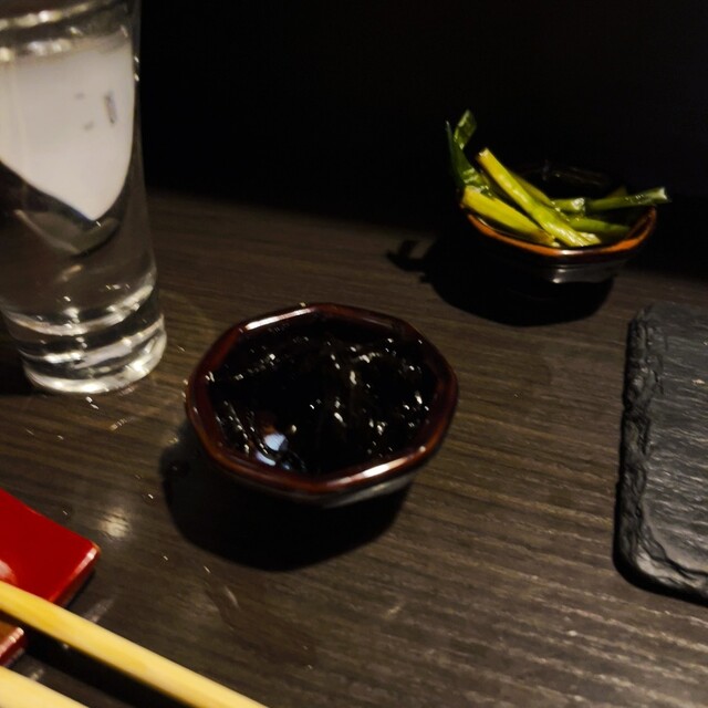 こちら、夜はお酒をオーダーがデフォルトなのでマスターおすすめの辛口と「蕎麦前三品盛り」で金華サバの生ハム、のしホタルイカ、夕焼け明太子をお願いしました。
