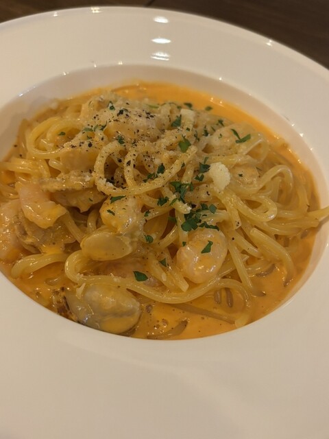 本日オススメのカルパッチョは金目鯛!見た目も美しく美味しい。和牛のソーセージは肉肉しくて、ポテトもいろんなカタチがあって楽しめます。ピザはクワトロフォルマッジ。4種のチーズ最高。パスタはエビとホタテのトマトクリーム。パスタはもちもちでソースは濃厚!次は違うのも食べたです。ティラミスも美味しかったー。ごちそうさまでした。
