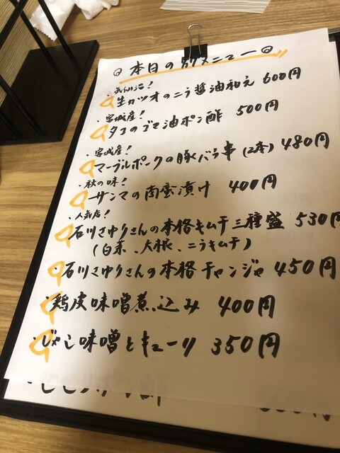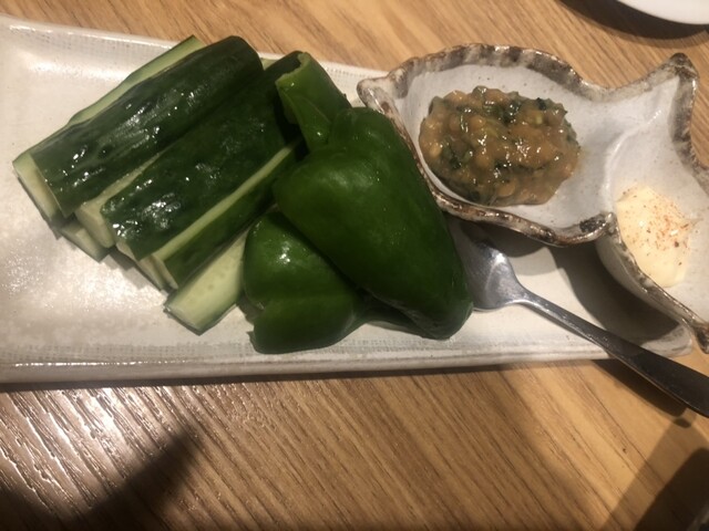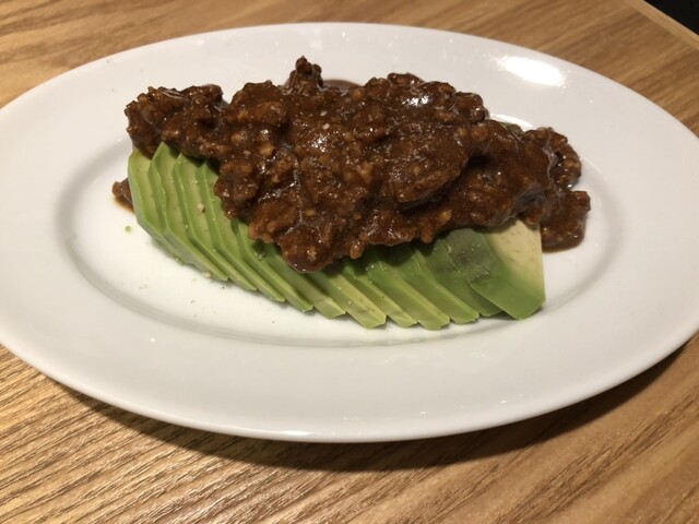 「今夜のオススメ」から、アボカドのシビれ肉ダレ(以前こちらでいただいた担々麺を思わせる肉ダレがたまりません)、自家製チーズのオーブン焼(言うことなし!ガーリックトーストもちゃんと美味しい)、カキのピーマン射込揚げ(ピーマンの中に牡蠣を入れて揚げるとは!思いもつきません。素材の味が良いですね)を。
