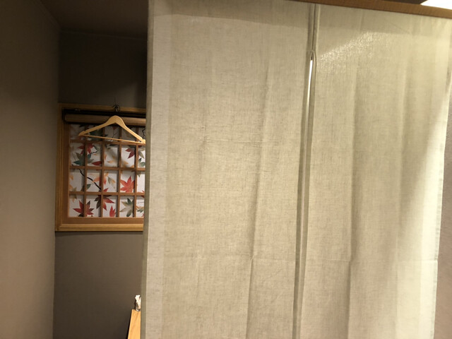 予約しておいた小上がり席。2人席と4人席の間に布で間仕切りができていました。奥の障子も紅葉柄で素敵。ますます落ち着く空間になりました。