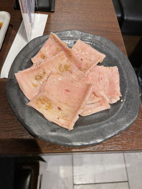 厚切りタンは一つのお皿に4つ。2400円くらいだったか値段的にも1人で来て頼むようなものじゃない笑。最低2人、いろんな種類を食べたいなら3、4人で来た方が良い。4人なら1人7000円でもっと食べられたと思うと3、4人で来るのがちょうどいいのかな。