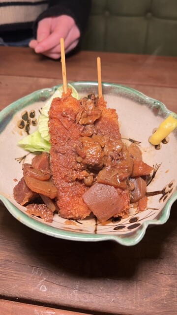 衣はサクサク、中はジューシーで、たっぷりどて煮が入っとるのも嬉しいポイント! どて味噌と衣の相性がよすぎて、おかわりしてしまった!!