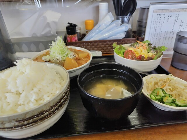 やわらかもつ煮 サラダ小鉢も充実 お椀も美味しいお店。