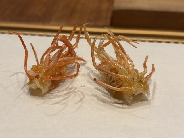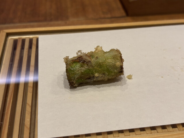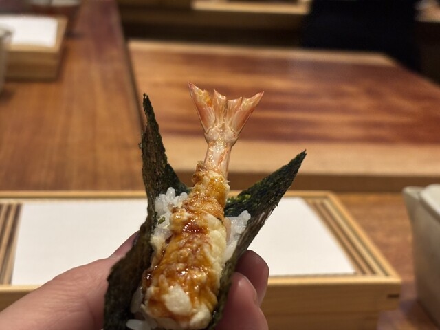 まずは王道の海老。塩で素材の甘みを堪能した後は、驚きの「海老天の海苔巻き」。揚げたてを大将から直接手渡しでいただくスタイルは、温度も鮮度もダイレクトに伝わる贅沢な瞬間です。さらに「あごあし」まで、海老の魅力を余すことなく引き出しています。