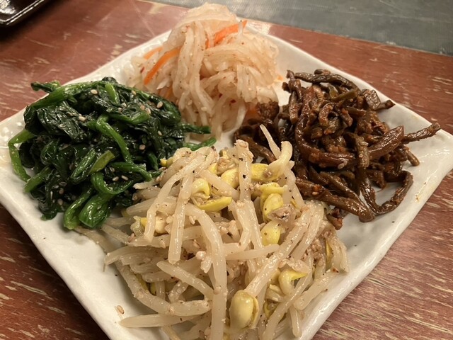 ナムル盛り合わせは優しい味付けで、箸休めにぴったり。チョレギサラダはごまの香りがふわっと広がって、お肉前の準備運動みたいな存在感。。