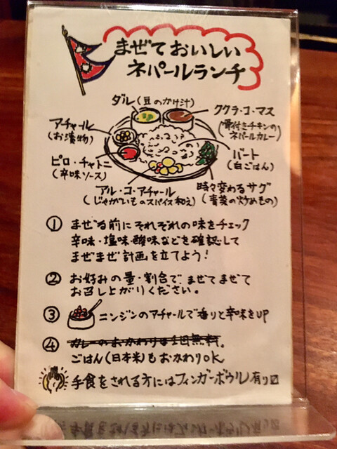 ネパールランチの食べ方は、テーブルに備え付けの図解もあるし口頭でも事前に説明していたので、家人も配膳後はスムーズに食べだすことができたようです。なにせ、このプレート内にある、カレーも他の全ての料理も全部美味しいので、大満足してくれました。やはり特に、青菜の炒め物とジャガイモの炒め物の味付けは気に入ったようでした。^^