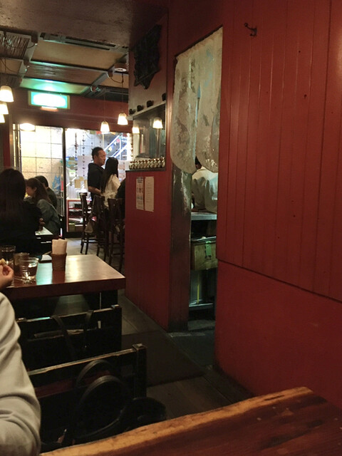 螺旋階段を下りた地下一階部分にあり、明るい外からでは結構薄暗くみえる店内。お昼時の12:10頃到着で、中を覗くとカウンター席は満席に見えたので、手指消毒して玄関前にある椅子に座って待とうかと思っていたら、ご店主が出て来られ、4人掛けのテーブル席に案内してくれました。このホスピタリティは嬉しいですね。