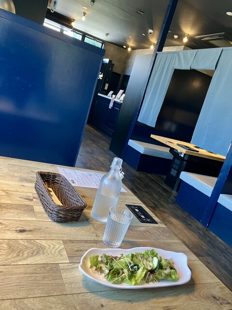 お盆休みの週、家族とスケジュールが別々でお昼はお一人様で外食となった日、お得なランチメニューを求めて再訪。^ ^ 予約無しでしたが、待たずにボックス席に案内してもらえた。すぐにウォーターボトルでお冷やが届く。注文はタブレット端末で。
