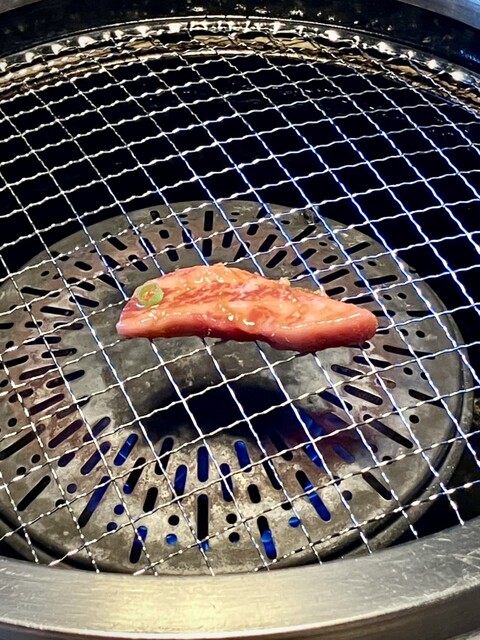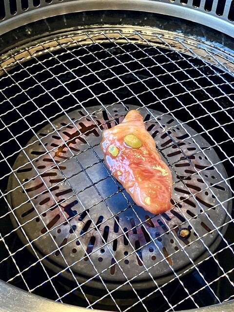 グリーンレタス&トマトのサラダがまず先に配膳。食べ切った頃に丁度肉やライス等がやって来ました。思っていたよりも結構volumeがあります。早速ネギ塩タンから焼いて頂くと、厚みも大きさも充分で、スライスレモンを搾って美味しくいただけた。タンだけで一杯目のライスが殆どなくなったため、タブレットでお代わりを追加(@0円)で注文。ハラミがもう直ぐ焼けるという頃に今度は配膳ロボットが、お茶碗一杯分のライスをテーブル迄運んで来た。受け取って手を翳すと厨房へ戻って行く仕組みらしい。
