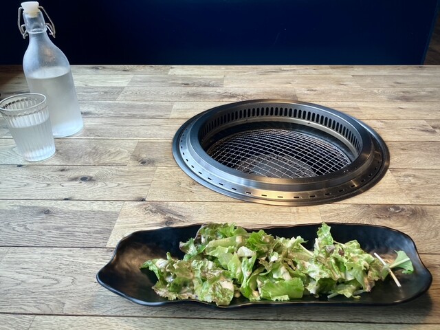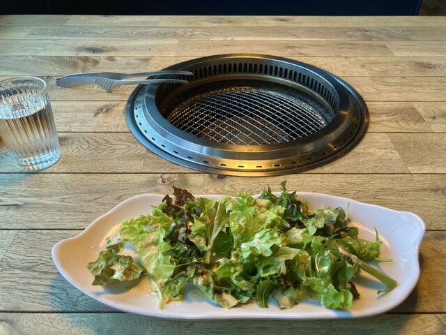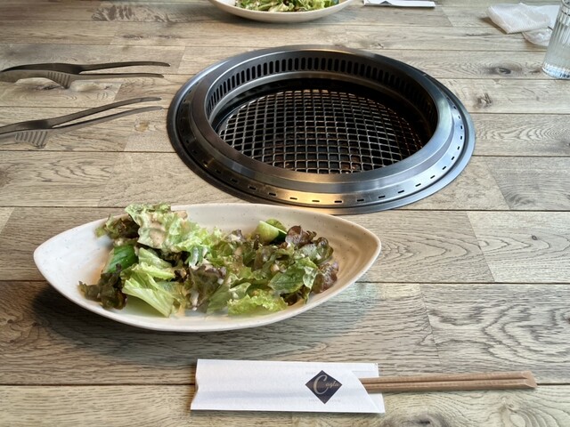 店内も同様にシンプルで洒落た雰囲気で、テーブルの配置や通路は広々としており、案内されたのは窓際のテーブル席。オーダーは全てタブレットで行ないます。ドリンクバー利用の場合、中央部にあるコーナーで自身で調達。お水も同様です。今回オーダーしたのは、お得な4人向けのファミリーセット(@9,680円税込)、テッチャン(@968円税込)x1、上ミノ(@968円税込)x1、ご飯(コシヒカリ中@275円税込x2、コシヒカリ小@165円税込x1)。ファミリーセットの内容は、ネギ塩タン160g、カルビ160g、赤身ロース160g、Caglaハラミ160g、地鶏タレ焼き100g、ウィンナーソーセージとキムチ3種盛合せとCaglaサラダです。