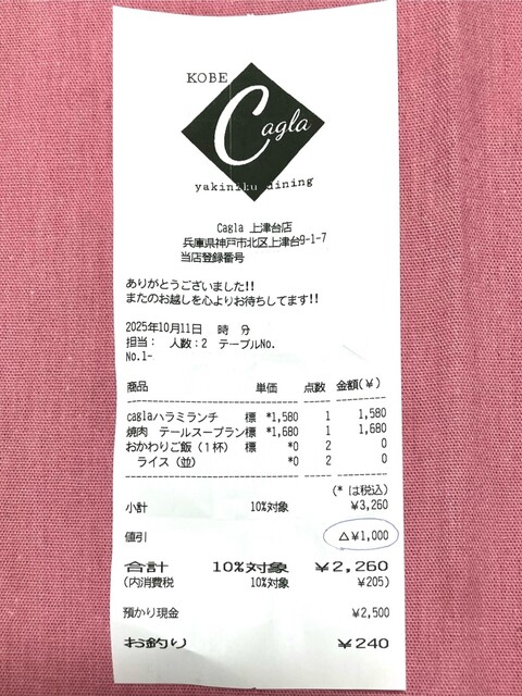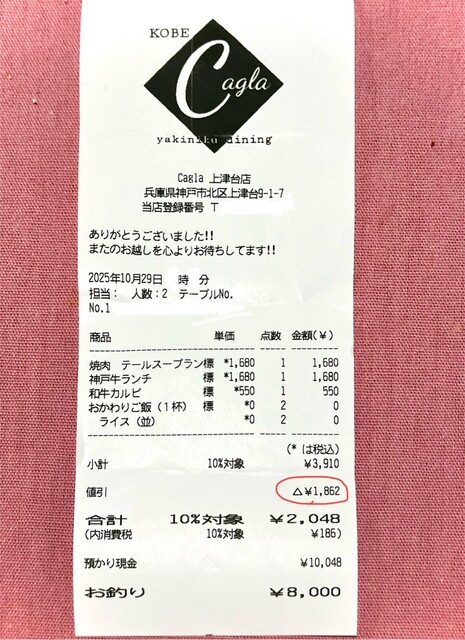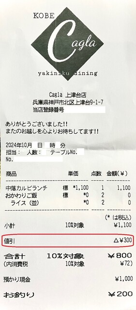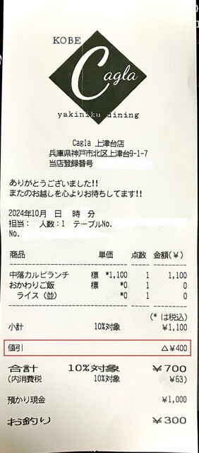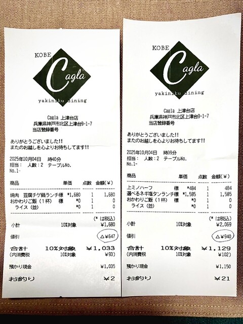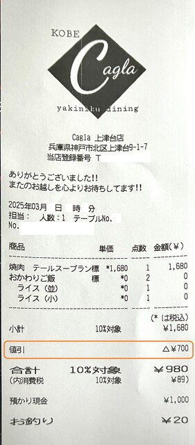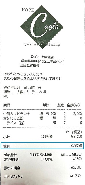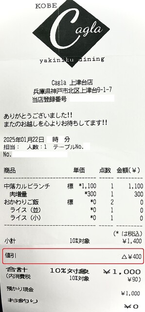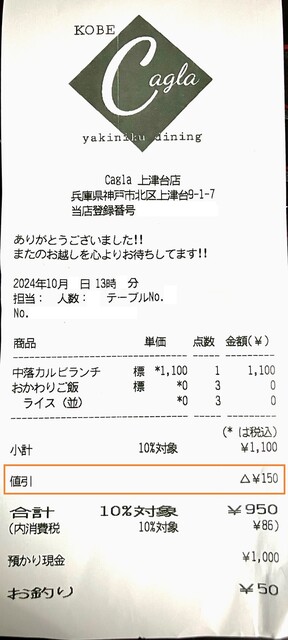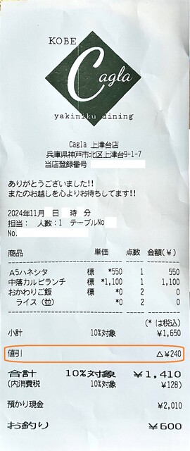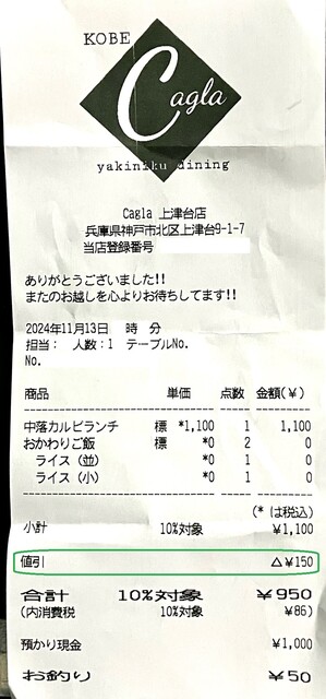 神戸カグラには大変お世話になりました。今回は保有ポイントを全て使わせてもらったので、超〜お値打ち価格での会計となりました。新しい店舗になっても、良質でリーズナブルなお肉と素晴らしい接遇とを期待しております♪