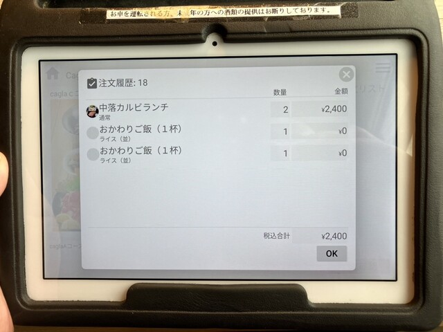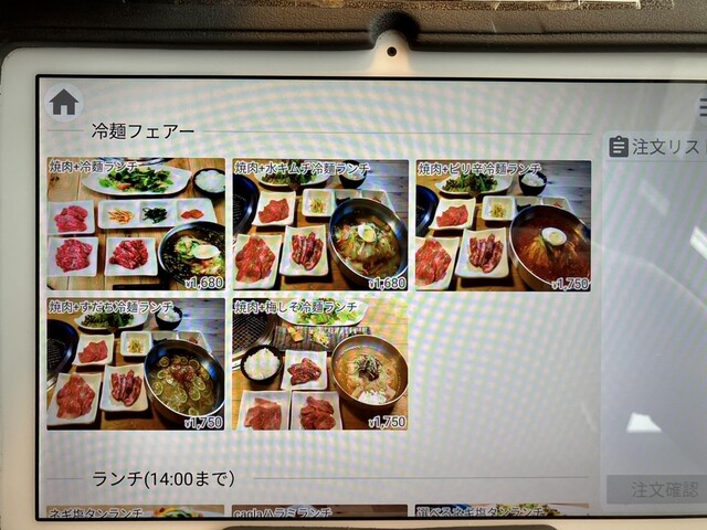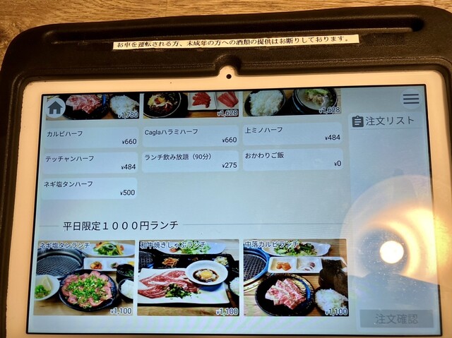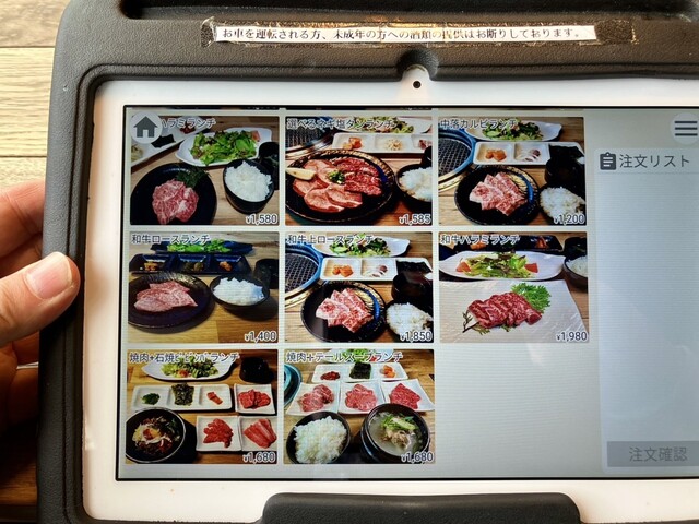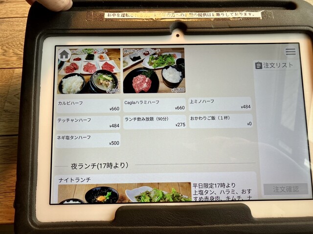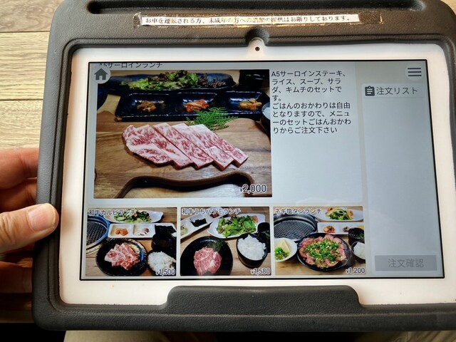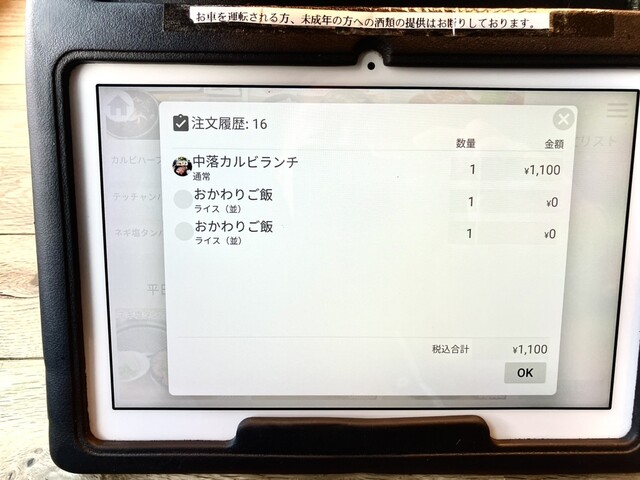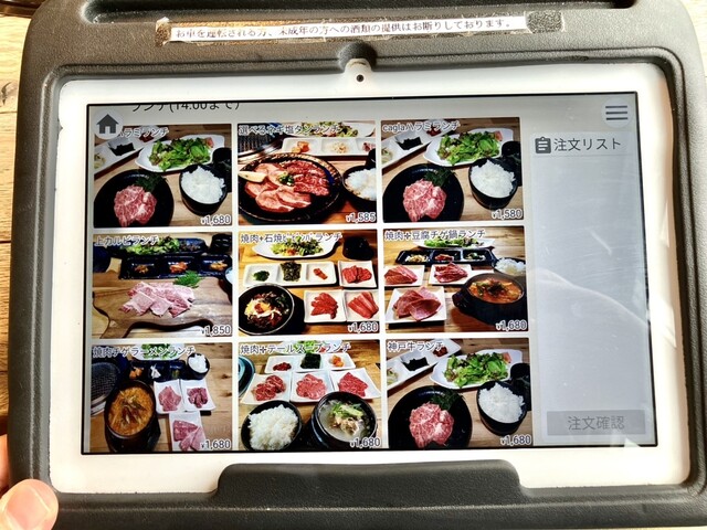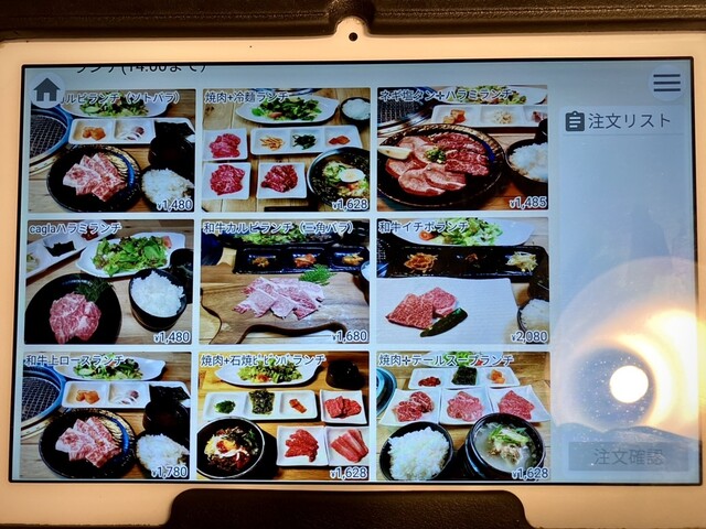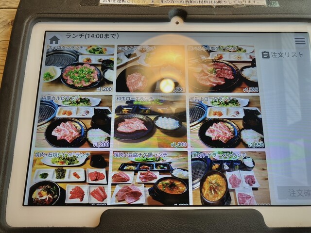 タブレットでオーダーしたのは、お値打ちなランチメニュー群の中でもとりわけお得感の高い「中落ちカルビランチ(@1,200円税込)」x2。