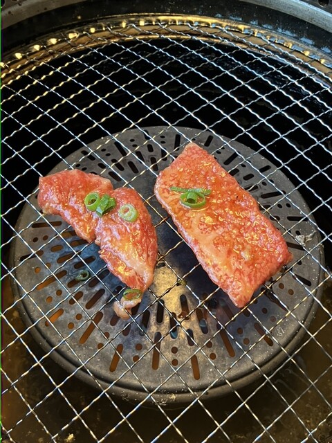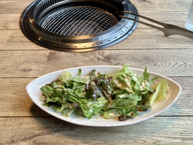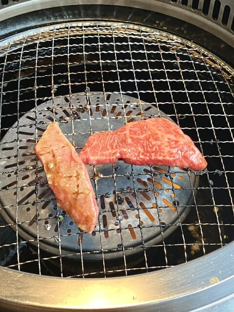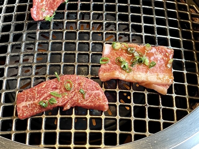 さて、グリーンサラダの配膳後、程なくしてメインの品々がやって来ました。早速焼きに入ります。やはり流石は神戸牛!サシの入りがキメ細かく、柔らかな肉の旨味と良質でアッサリした脂のバランスが非常に素晴らしい逸品です。一方で和牛カルビは、濃厚な甘い脂の旨味が、表面をこんがりと焼くことで、赤身と共に際立つ香ばしさとなって、これまたすこぶる美味しいです。